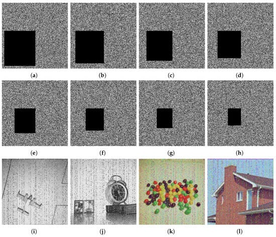 (a–h) Sequence of encrypted images destroyed by data loss attack and (i–l) decrypted images after data loss attack.