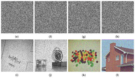 (a–h) Sequence of encrypted images destroyed by salt and pepper noise attack with noise density = 0.2 and (i–l) decrypted images after noise attack.
