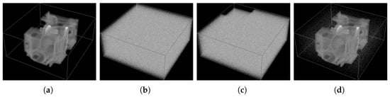 (a) Original 3D image of engine, (b) encrypted image, (c) destroyed image by data loss attack and (d) decrypted images after data loss attack.