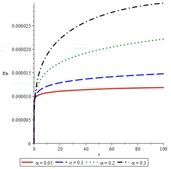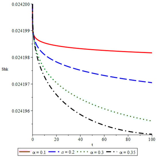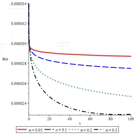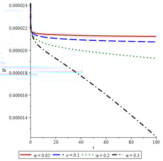In the same way, other results can be obtained for different values of . The fractional order in the mathematical model is used to describe memory effects, hereditary properties, and anomalous dynamics in systems in physics, epidemiology, and engineering. The fractional order includes a concept of history dependence and non-locality, which cannot be achieved with the standard integer-order models.