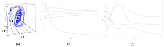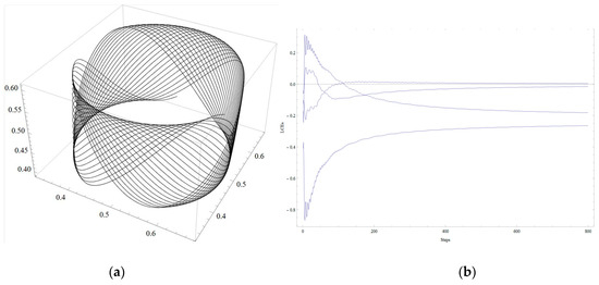 (a) The 123 projections of several trajectories, going to the attractor, matrix (24); (b) Lyapunov curves for the trajectory starting at (0.4, 0.6, 0.4, 0.6), matrix (23), Lyapunov exponents (0.0118, −0.0167, −0.0385, −0.2905); (c) Lyapunov curves for the trajectory starting at (0.4, 0.6, 0.4, 0.6), matrix (24), Lyapunov exponents (0.2535, −0.0247, −0.5569, −0.6719).