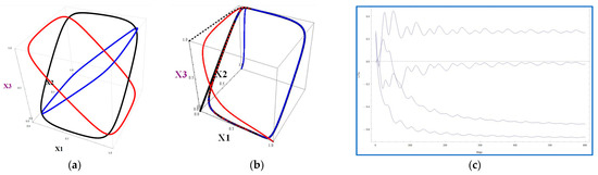 (a) The 123 projections of the trajectories of system (17). Black is for the trajectory with the start point at (0, 0, 0, 0), blue is for the initial conditions (0, 1, 0, 0), red is for the initial conditions (1, 0, 0, 0), and dashed for (0, 0, 1, 0); (b) the 123 projections of the trajectories of system (18) with the initial conditions (0, 0, 0, 0) (black), (0, 1, 0, 0) (blue), (1, 0, 0, 0) (red), (0, 0, 1, 0) (dashed); (c) the Lyapunov curves for the trajectory of system (18). The initial conditions are (0.4, 0.6, 0.4, 0.6). The Lyapunov exponents are {{0.253554, −0.0246819, −0.556984, −0.671894}, 2.41091}. The last number is the Kaplan–York–Lyapunov fractal dimension.