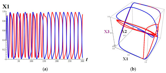 (a) The components of two solutions of system (18) with the initial conditions (0.4, 0.6, 0.4, 0.6) (red) and (0.41, 0.6, 0.4, 0.6) (blue); (b) The 123 projections of two trajectories of system (18) with the initial conditions (0.4, 0.6, 0.4, 0.6) (red) and (0.41, 0.6, 0.4, 0.6) (blue).