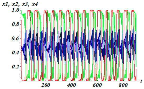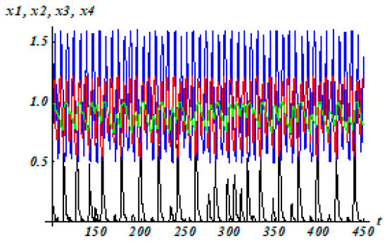 v1 = 1, v2 = 1, v3 = 1, v4 = 1; μ1 = 4; μ2 = 5.02, μ3 = 8, μ4 = 8; θ1 = (w11 + w12 + w13 + w14)/2, θ2 = (w21 + w22 + w23 + w24)/2, θ3 = (w31 + w32 + w33 + w34)/2, θ4 = (w41 + w42 + w43 + w44)/2. Let initial conditions be (0.592; 0.85; 2; 1). The solutions for system (10) with matrix (25) are depicted in Figure 6. It can be observed that the solutions exhibit irregular behavior. For a nonlinear dynamic system, the number of Lyapunov exponents coincides with the dimension of the phase space. There are four such indicators in our example. The results of testing system (10) on the Lyapunov exponents for the initial data (0.592; 0.85; 2; 1) are (0.05; 0.00; −0.45; −0.78), where LE_1 > 0, LE_2 = 0, LE_3 < 0, and LE_4 < 0. A positive Lyapunov exponent indicates chaotic behavior in the system [30].