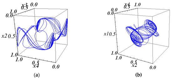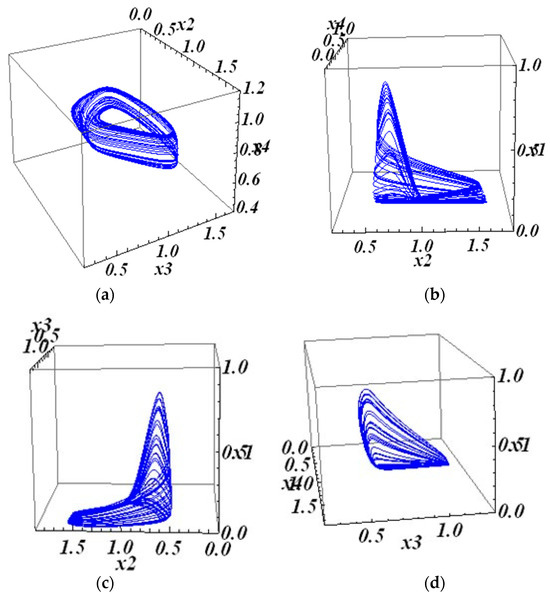 The Lyapunov exponents are (0.04; 0.00, −0.64; −1.11) with the initial condition (0.4; 0.9; 0.4; 0), where LE1 > 0, LE2 = 0, LE3 < 0, and LE4 < 0. The solutions of system (10) with regulatory matrix (26) are shown in Figure 8. The three-dimensional projections of this attractor are shown in Figure 9.
