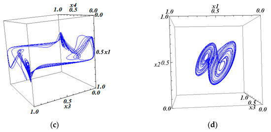 The 3D projections of the 4D attractor in system (10) with matrix (26): (a) the 234 projection of the 4D attractor; (b) the 124 projection of the 4D attractor; (c) the 123 projection of the 4D attractor; and (d) the 134 projection of the 4D attractor.