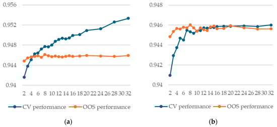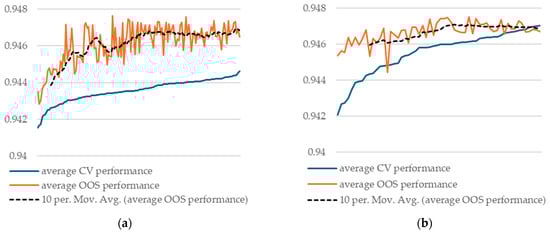 Average CV and OOS performance across all 40 train/test splits, sorted by CV performance: (a) 144 different random forest models with splitrule = “hellinger”/split; (b) 58 different XGBoost models/split.