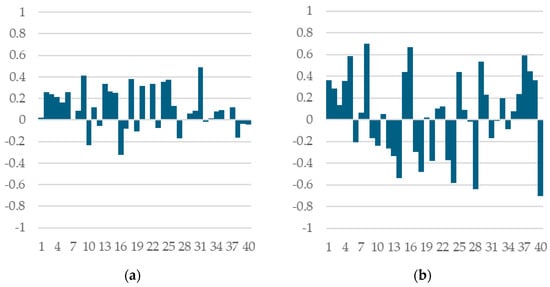 Correlation coefficients between CV and OOS performance across all 40 train/test splits (a) random forest models with splitrule = “hellinger”; (b) XGBoost models.