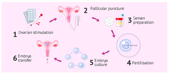 IVF is a process that involves the fertilization of oocytes outside the female reproductive system, typically in a laboratory setting [7]. The process begins with the monitoring and stimulation of a woman’s ovulatory process, followed by the removal of ova from the ovaries and their fertilization with sperm in a laboratory [2]. The resulting embryos are then cultured for a period of time before being transferred into the uterus [8] (see full process in Figure 1). This technique, initially introduced in the 1970s, has been used to treat female infertility caused by damaged or blocked fallopian tubes [9]. The success of IVF has been attributed to various factors, including the development of novel laboratory procedures and techniques [10].