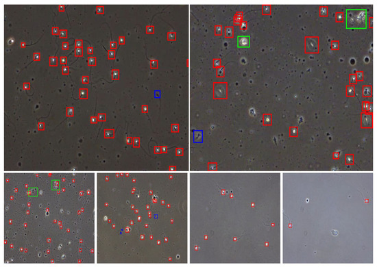 Representative video frames of wet-mount semen with automated bounding-box annotations from VISEM [49]. Top: Classification examples show individual sperm (red), clusters (green), and small/pinhead sperm (blue). Bottom: Visual comparison of samples with decreasing sperm concentrations (left to right: high, medium, low).