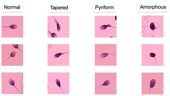 In parallel, morphology and DNA integrity represent complementary aspects of sperm quality that influence fertilization success and embryo development. Morphological assessment involves the classification of sperm based on structural attributes, including head shape, midpiece alignment, and tail length. An example of head morphology classification can be found in Figure 3. AI algorithms trained on labeled datasets can detect subtle morphological deviations that might be overlooked in manual inspections. On the other hand, DNA integrity is typically evaluated using fluorescent staining and specialized imaging techniques that reveal fragmentation or chromatin condensation. While more challenging to automate, recent deep learning approaches have shown promise in identifying DNA damage from image-based data, thus broadening the scope of CASA systems beyond conventional motility and morphology analysis.