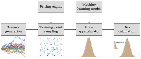 In the context of implementing the and calculation using Monte Carlo simulation, banking institutions tend to avoid direct use of pricers, as it is time consuming and makes them inefficient. Certain banks prefer to use proxies based on sensitivity calculation and second-order Taylor developments to compute the possible losses of derivative portfolios [], see Appendix C. Although these approaches offer performance gains, their precision is often questioned. Recently, alternative approaches have emerged that aim to strike a balance between computational performance and precision in risk calculation. Among these methods, the works of [,,] explore the application of Gaussian process regression in finance, and [] discuss the use of neural networks in the same context. The common idea behind these studies is to use machine learning models as interpolation tools, also known as surrogate models, to estimate derivative prices. More recently, ref. [] used Chebyshev polynomials as interpolators, combined with principal component analysis techniques (PCA), for financial risk calculation, aligning with the same line of thought. Figure 1 illustrates the risk calculation process that employs these innovative machine learning approaches, involving only a few complete revaluations of a derivative portfolio.