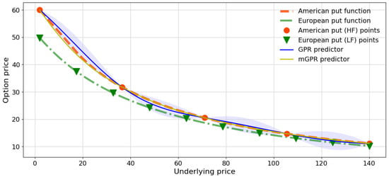 Figure 2 and Table 2 demonstrate the numerical test of an American put of strike 62. The configuration of this experiment is detailed in Section 5 and Section 6.1. In particular, the GPR is trained with only 5 American put prices, while the mGPR integrates additionally 10 European prices as low-fidelity data. All training points are drawn from a regular grid of the underlying asset within an interval [1, 140], and test points are uniformly sampled within the same interval. We observe a significant mismatch of the GPR estimate (cf. blue curve), notably in the in-the-money region, whereas the mGPR estimate (cf. yellow curve) satisfactorily fits the American put price computed using a binomial tree with 100 time steps. Additionally, the mGPR provides smaller prediction uncertainty represented by the yellow shadow interval, which closely aligns with the yellow curve and is visually indistinguishable in Figure 2. For further comparison, we also implement a second standard GPR, learning the discrepancy between the American and European prices, with the European price serving as a control variate to help reduce the variance of the target American price, and the Barone–Adesi and Whaley (BW) approximation []. Their results are then reported in Table 2.