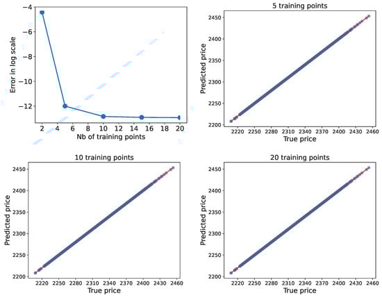 where is the sub-portfolio corresponding to the j-th stock. We build the approximate of each by one-dimensional Gaussian process model. To this end, for , we sample N equidistant training points of , say , in a determined range , and the corresponding price . As this is the one-dimensional interpolation case and the price functions in finance are usually well behaved, we only need to recall the pricing engine few times for sampling training data. For example, in the mono-asset portfolio experiments [], the GPs can reach good results using only . Once the learning is complete, the GP price of a sub-portfolio at a new point is the predictive mean of the posterior distribution