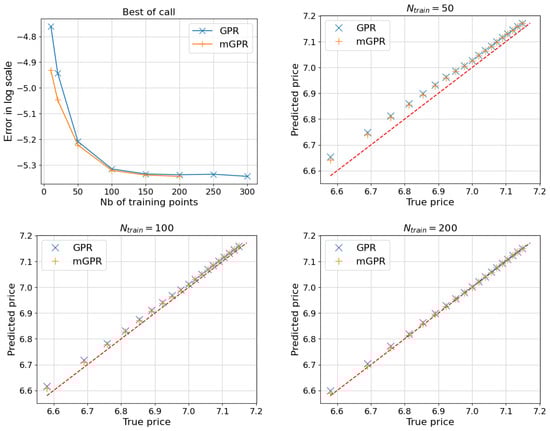 A parallel line of research investigates the use of Gaussian processes (GPs) and Bayesian optimization in finance [,,,,]. The GP is a generalization of a Gaussian random vector and can model stochastic processes on continuous functions, where the covariance matrix is replaced by a kernel function. Two notable applications of Gaussian process regression (GPR) have recently been published. The first focuses on fast derivative pricing and hedging, particularly in markets modeled with a limited set of parameters []. This approach is efficient for statistical learning, as the small number of input parameters allows the machine to quickly learn the function. The main advantage, as highlighted in [], is the significant reduction in computation time while accurately learning exotic option prices, sensitivities, and hedge parameters. The second contribution [,] addresses calculating value-at-risk (VaR) and expected shortfall for a portfolio of derivatives, where the revaluation of the portfolio is performed as a linear combination of instrument prices using the GPR method. Numerical tests show that the GPR approach yields identical results to full revaluation and outperforms the Taylor expansion method. These results suggest promising applications in risk management and regulatory capital calculations. We aim to further explore the quantitative analysis and potential improvements in pricing, as well as VaR and expected shortfall computations for an entire trading book.