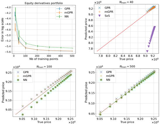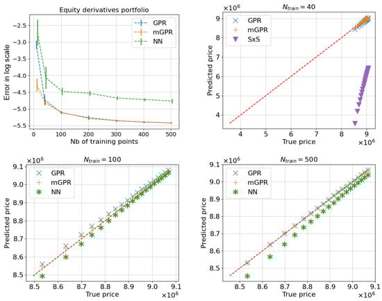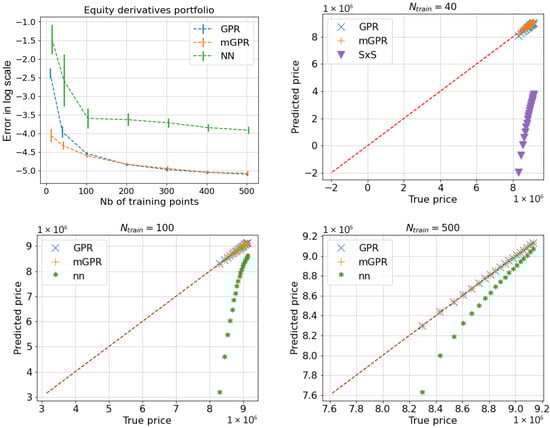 MAPE of estimates for an equity option portfolio with a one-month horizon as a function of the number of training points (top left). The error bars represent the standard error, calculated by rerunning the learning process on 10 redrawn training sets. Q–q plots comparing predictors learned from 40 (top right), 100 (bottom left), and 500 (bottom right) points against the true price, i.e.,Monte-Carlo price with 100,000 paths, below their 10% quantile levels. TheMAPE of SxS prediction is not included in figures due to its high value, but it can be found in Table 11.