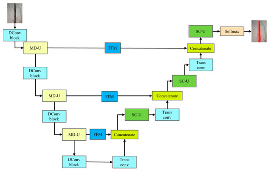 The overall framework of PipeU-NetX for the pipe gallery disease detection network is shown in Figure 1. The MD-U down-sampling module was designed in the model, which combined the maxpooling layer with the convolution layer to effectively realize the spatial dimension reduction and information aggregation of features. At the same time, the SC-U up-sampling module was designed. By combining the up-sampling layer and convolution layer, the fine recovery and detail enhancement of the feature map were realized. The dynamic convolution technology was introduced into the subsampling module SC-U, which not only enhanced the feature extraction ability of the network model but also significantly reduced the computational cost. The embedding of the convolution layer effectively made up for the loss of feature information that may be caused by the lack of trainability of the traditional maxpooling layer and up-sampling layer so as to improve the feature fidelity in the sampling process and significantly improve the segmentation accuracy of pipe gallery diseases [12,13]. Finally, the hopping connection part of the decoder was improved, the hopping connection enhancement mechanism was adopted, and the FFM feature fusion module was introduced to enhance the attention of the model to the characteristics of pipe gallery disease in different feature maps, optimize the efficiency and accuracy of feature fusion, and improve the accuracy and efficiency of the reconstructed image of the decoder.