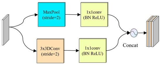 The down-sampling mechanism of the traditional U-Net network depends on the maxpooling operation [14]. Although this process can effectively reduce the size of the feature map, it will inevitably lose rich semantic information and affect the accurate segmentation of micro-pipe gallery diseases [15]. According to the characteristics of different shapes and areas of disease in the pipe gallery disease image, the PipeU-NetX model innovatively designed the MD-U down-sampling module, which combined the advantages of maxpooling and dynamic convolution so that the down-sampling process could be learned. As shown in Figure 2, the input characteristic graph first passed through the maxpooling layer and the dynamic convolution layer in parallel. The latter effectively reduced the training complexity by reducing the model parameters and helped to prevent the model from overfitting. Then, 1 × 1 convolution was applied to the feature map after the pooling and convolution operation to realize the integration and interaction of cross-channel information. At the same time, nonlinear transformation was introduced to enhance the ability of feature expression. Finally, the processed feature map was spliced along the channel dimension and passed to the subsequent convolution layer to realize the deep fusion of information and improve the overall representation ability of the network. The whole down-sampling process can be expressed by the following formula: