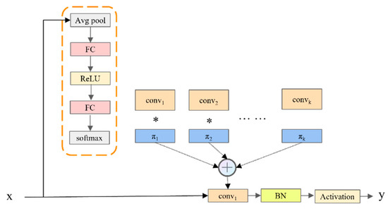 The dynamic convolution DConv in the MD-U module is shown in Figure 3. Dconv dynamically generated convolution kernel weights and biased attention coefficients closely related to input features by integrating global average pooling, the full connection layer, and the Softmax activation function [16]. This process not only realized the intelligent aggregation of multiple convolution kernels but also skillfully introduced the attention mechanism, which significantly enhanced the feature representation ability and learning efficiency of the model without increasing the depth and width of the network. Finally, these finely adjusted convolution kernels were applied to the input features, which promoted more efficient and richer nonlinear feature learning and further improved the overall performance of the model. The overall model of dynamic convolution is shown as follows: