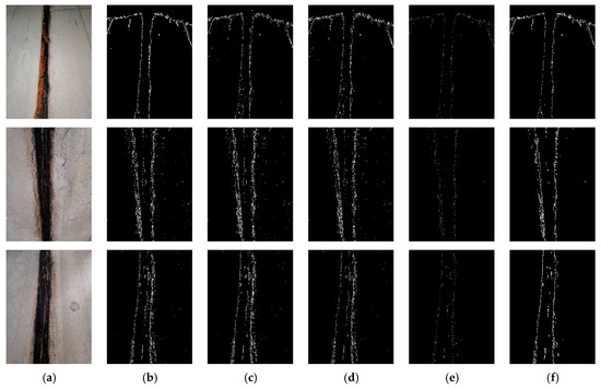 Comparison of the segmentation of pipe gallery disease areas: (a) original drawing; (b) mask image; (c) U-Net; (d) FCN; (e) Deeplabv3+; (f) PipeU-NetX.
