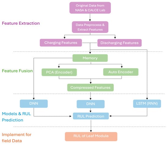 The suggested model framework for predicting the RUL is shown in Figure 1. Initially, the original data’s insightful properties were retrieved, exposing important trends and patterns that might be used to predict the batteries’ RUL.