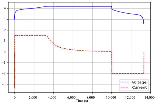 The testing process was repeated until the battery capacity degraded to 70% of its initial value. A complete cycle comprises both a charge and a discharge sequence. Figure 2 illustrates a typical charge–discharge cycle of a lithium-ion battery. All charge–discharge cycles were compared against this reference pattern and those that deviated significantly were excluded from the dataset, as such anomalies could negatively impact the performance of the neural network.