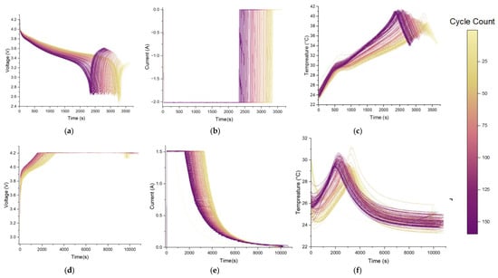 For instance, the figures for a B0005 battery, depicted in Figure 3, illustrate the variation in voltage, current, and temperature of the battery cell B0005 over time during the charging and discharging processes across multiple cycles. Figure 3a–c corresponds to the discharge cycles while Figure 3d–f corresponds to the charge cycles. By analyzing these curves, it is evident that certain parameters of lithium-ion batteries are highly sensitive to the cycle count and exhibit clear trends. For instance, Figure 3a highlights whether all discharging cycles follow a typical pattern, as shown in Figure 2, and highlights how the time taken to reach the minimum terminal voltage decreases as the cycle count increases. Similarly, Figure 3e highlights how the constant current (CC) charging time shortens with each successive cycle.
