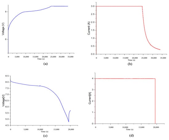 Leaf Gen 01. (a) Charge voltage vs. time; (b) charge current vs. time; (c) discharge voltage vs. time; (d) discharge current vs. time.