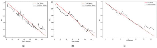 Model-based and data-driven methods are the two categories into which the approaches to RUL prediction can be divided []. Model-based methods rely on comparable circuit models, dynamic models, and electrochemical concepts. Despite the great accuracy of model-based strategies, data-driven approaches have garnered significant attention [] because of their limited applications and complexity []. Nevertheless, the accuracy of these machine learning models is rather moderate [].