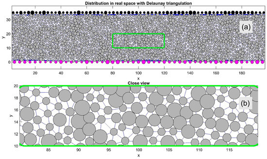 Figure 1 are interconnected using Delaunay triangulation (thin lines), which allows for rapid identification of each particle’s nearest neighbors. This triangulation is essential for characterizing the system’s structural order and its temporal evolution. For better visualization, a magnified view of the central region (highlighted by a green rectangle in subplot (a)) is shown in subplot (b). The main system includes a diverse mix of particles with varying radii