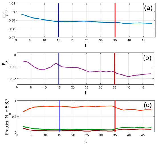 This ordered structure is maintained even during horizontal plate motion, up until the point when external heating is applied. This moment is marked by the vertical red line. As expected, the applied heating rapidly disrupts particle positions, increasing defects in the previously ordered hexagonal structure. In other words, the balance shifts from particles with six neighbors toward those with five or seven. This trend is clearly visible in subplot (c), where the orange curve (six neighbors) declines, while the other two rise.