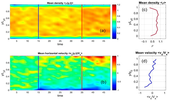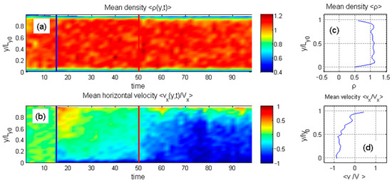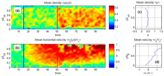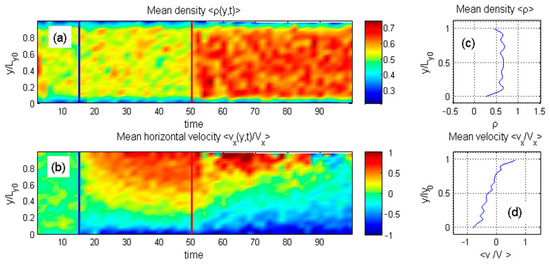 Figure 3a,b. Here, the discrete particle distributions are smoothed into continuous density fields and averaged along the horizontal axis. Instantaneous density and velocity distributions appear in subplots (c) and (d). These continuous values are also accumulated over time and displayed as color maps, with individual color bars in (a) and (b) reflecting different physical quantities.