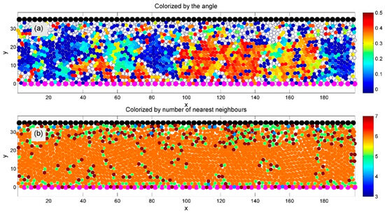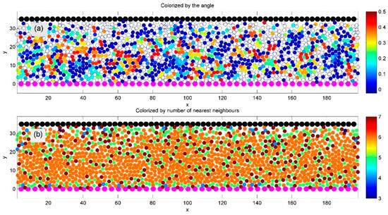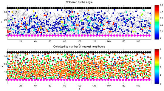 Figure 1 demonstrates an ensemble resulting from the interaction forces defined in Equations (5)–(7). It shows a typical instantaneous particle distribution between the upper and lower surfaces. These surfaces contain fixed particles (depicted in black and magenta), which move in opposite horizontal directions. The same interaction rules apply to these surface-bound particles as to the internal ones.