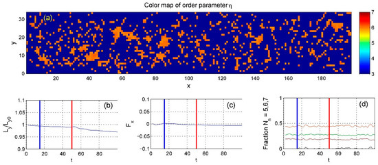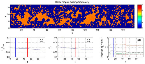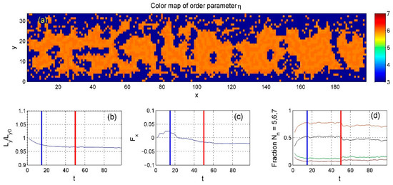 Figure 7, where orange regions once again indicate areas with ideal hexagonal order. The figure also shows the time-dependent position of the upper boundary, determined by the balance between the applied force and the internal particle pressure (Equation (8)). Subplot (c) shows the total friction force resulting from the relative motion of the upper and lower boundaries.