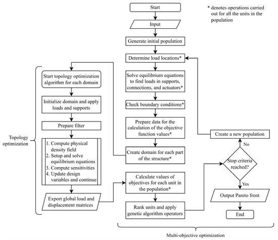 The procedure simultaneously optimizes the macrogeometry of the system (lever lengths, distances between joints, locations of load points) and the geometry of individual parts to reduce their mass. This is achieved through a two-layer optimization approach, where a multi-objective optimization algorithm determines the multi-body system microgeometry, while a nested topology optimization algorithm refines the structures of individual bodies. The multi-objective algorithm incorporates design variables, boundary conditions, and objective functions to optimize the overall system. It calls on the topology optimization algorithm, which computes the compliance-related objective function values (for more details, see Section 2.2).