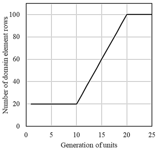 Hence, mesh density in the first 40% of generations was taken as 20% of the final mesh density. Next, the mesh was refined linearly until reaching the final value at 0.8 of the maximum number of generations (ngen). The fully refined mesh was then used until the maximum number of generations ngen was reached. For example, as shown in this paper, the final number of domain rows was taken as 100 and the maximum number of generations ngen = 25. Changes in mesh refinement are described in Figure 2.