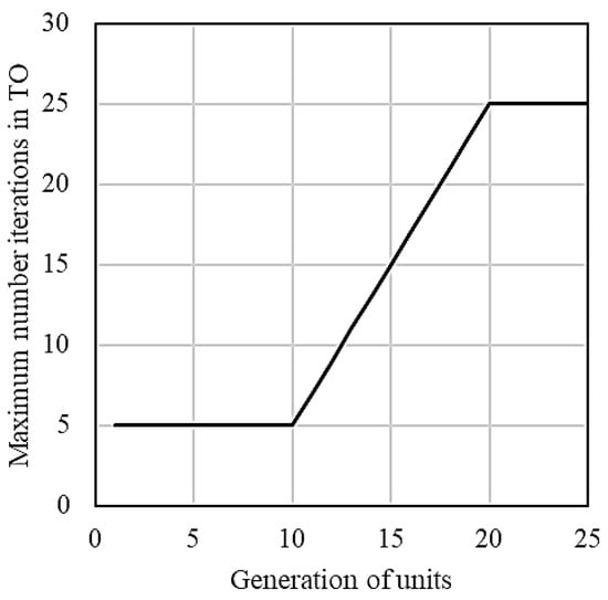 The number of iterations during the first 40% of generations was taken as 20% of the number of iterations in the final generations. Similarly to Strategy I, it was linearly increased until it reached the final value at 0.8 of the maximum number of generations (ngen). Finally, a maximum number of iterations max_iter = 25 was used until reaching the maximum number of generations ngen. The number of domain rows was held constant at 100 and the maximum number of generations was ngen = 25. Changes in the number of iterations of the topology optimization algorithm with generations are given in Figure 3.