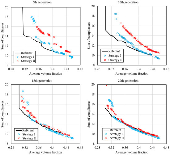 Figure 5 shows the evolution of Pareto-optimal solutions across four selected generations (5th, 10th, 15th, and 20th generations) for the Reference, Strategy I, and Strategy II optimization approaches. The solutions with rather high compliance were outliers and were not shown in the figure for clarity. In all the figures, the horizontal axis represents the average volume fraction, while the vertical axis is the sum of compliances. The Reference strategy defines a well-developed Pareto front in 5th generation, while Strategy I and Strategy II significantly deviate, particularly for higher compliance values. This is due to both alternative strategies still being in the early exploration phases, as intended, providing a lower number of quality solutions.