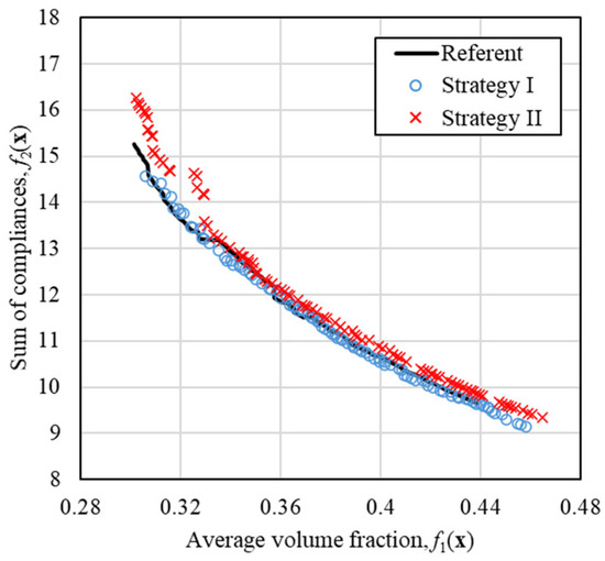 Computational cost was evaluated using the time needed to carry out the calculations. The optimization was carried out according to the proposed procedure, resulting in Pareto-optimal fronts including all the sets of optimal solutions. The results obtained using Strategies I and II were compared to the results obtained by running the optimization procedure without any mesh coarsening or number of iterations of the topology optimization algorithm. Results obtained in this way are referred to as “reference” in the continuation of this section.