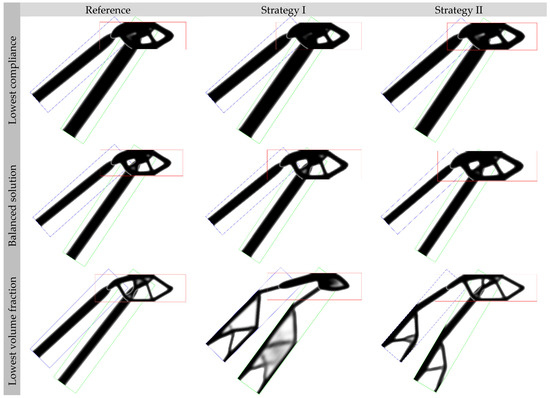 To better illustrate the structures obtained for the example case, a total of nine solutions were selected from Pareto-optimal fronts—three for each of the strategies. Among the three, solutions with the lowest compliance, lowest volume fraction, and the balanced solution (50th solution on the Pareto front of the 100 in total) were selected. The selected structures are shown in Figure 7, where Domain 1 has blue borders, Domain 2 has green borders, and Domain 3 has red borders. The solutions with the lowest total compliance were nearly identical, regardless of the applied computational cost reduction strategy. Similar behaviour was observed for balanced solutions (Figure 7, 2nd row). In these, the parts described by Domain 1 and Domain 2 were straight levers; the multi-objective optimization ensured that said parts were positioned to ensure only compressive/tensile loads.