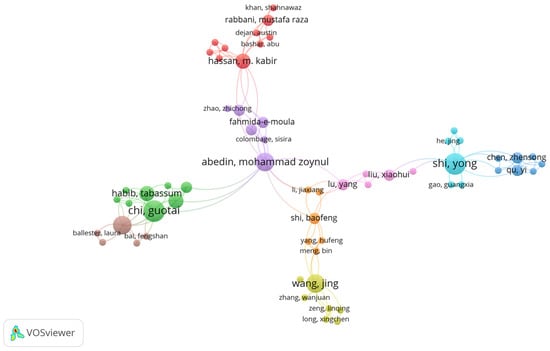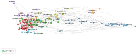 Author collaboration networks or co-authorship, as frequently used, analyze the collaboration patterns among authors based on joint publications, with the intention to reveal research communities and leading contributors within the fields of CRA. Our co-authorship analysis was conducted using VOSviewer 1.6.20. To have the broadest spectrum of results, we applied no minimum requirements regarding the number of publications and citations. Out of 2952 authors, 60 were connected, resulting in nine distinct collaboration clusters, as shown in Figure 2.