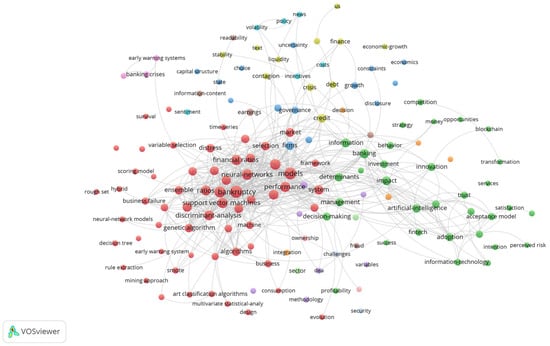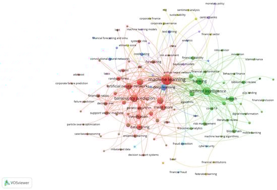 To identify the thematic structure of research in computational risk analytics (CRA) in banking, a co-occurrence analysis of author keywords (DE) was conducted using VOSviewer. The threshold was set at a minimum of five occurrences, resulting in 121 keywords, of which 117 were connected and visualized in the network. These were grouped into 12 clusters based on their co-occurrence link strength, forming a detailed thematic map as illustrated in Figure 3. Keyword co-occurrence (DE—author keywords) network.