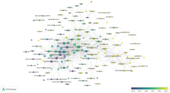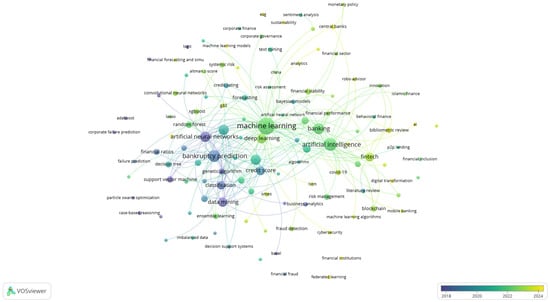 As far as temporal evolution is concerned (Figure 4), the overlay scores by average publication year indicate an evolution of focus toward more recent concepts such as Extreme Gradient Boosting (XGBoost), blockchain, explainability, and financial stability, especially post-2022.