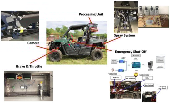 Precision farming is a technique developed to improve crop yields, reduce chemical usage, and keep environmental impacts at a lower level, and the inclusion of robotics into conventional farming helps in achieving these goals. Researchers have been rigorously studying autonomous weed detection techniques and herbicide application to minimize cost and herbicide usage. There are evidences showing a rise in herbicide resistance among diverse weed species over time []. Driven by the need to mitigate labor, cost, and herbicide resistance associated with weed management, there has been significant increase in interest in agricultural robots with autonomous capabilities for weed detection and eradication. The Mechatronics and Autonomous Systems Research Lab (MARL) at Purdue University in Indianapolis has developed one such robot, as shown in Figure 1. This autonomous robot was built by retrofitting a Yamaha Wolverine 4 × 4 All-Terrain Vehicle with a variety of sensors and actuators capable of GPS guided navigation, autonomous weed detection, and herbicide application via a sprayer system [].