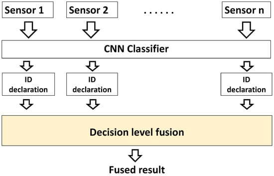 Multi-sensor fusion means the combination of information from multiple sensors (homogeneous or heterogeneous) in a meaningful way that can overcome any limitations inherent to a single sensor or information source []. A supervised or unsupervised algorithm (in this study CNN is used) is used to make decisions from available data. Subsequently, the decisions obtained from many sensors are integrated through the utilization of an information fusion method, as depicted in Figure 3. A central challenge at the decision-making stage in multi-source information fusion lies in appropriately representing and resolving imprecise, fuzzy, ambiguous, inconsistent, and potentially incomplete information []. Dempster–Shafer (DS) evidence theory, as an uncertainty reasoning method, was proposed by Dempster [] and further developed by Shafer []. The DS evidence theory is a well-established system for managing uncertainty, serving as a means of controlling uncertain environments [,]. This evidence theory is extensively utilized in different fields of information fusion, such as decision making [], pattern recognition [], risk analysis [], fault diagnosis [], and so on [].