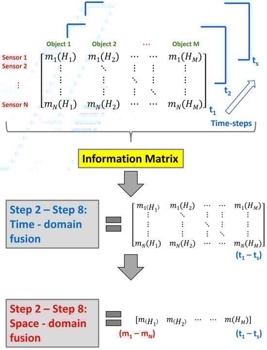 - Step 1: Construct a multi-sensor information matrix for space domain fusion by considering a system with N sources of evidence (sensors) within the frame representing the objects to be classified.