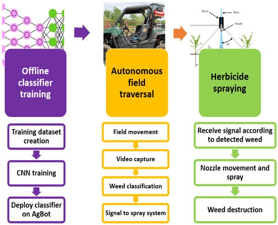 The proposed system is developed following a three-step methodology. Initially, a weed image dataset is curated, and the CNN model is trained using this dataset. Subsequently, the trained model is evaluated in a test environment utilizing a single-camera-based video feed in different scenarios. Finally, a multi-sensor-based sensor fusion algorithm is implemented to overcome limitations observed in the single-camera feed and also address common issues such as the presence of a faulty sensor and partial occlusion. The output from the weed classification process is integrated into the control spray mechanism of the AgBot used in the test environment. The classification and spray system pipeline is demonstrated in Figure 5.