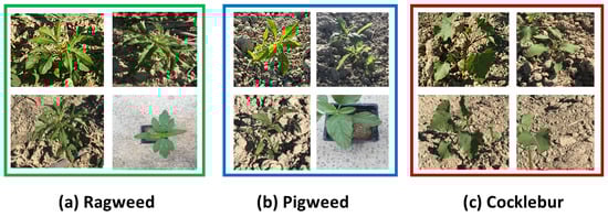 A widely accessible 16-megapixel digital camera was used to capture photos to construct the dataset. The IUPUI Greenhouse cultivated three common species of corn weeds: Xanthium strumarium (Common Cocklebur), Amaranthus retroflexus (Redroot Pigweed), and Ambrosia trifida (Giant Ragweed) for this purpose. Additionally, we visited real corn fields during the summer to photograph weeds. Sample photographs are shown in Figure 6. The study used a maximum input image size of 150 by 150 pixels, corresponding to the input dimension of the convolutional neural network (CNN), which the 16-megapixel camera supported adequately. The dataset comprises 1993 images in total, with the distribution across different classes and sets presented in Table 2. Given that transfer learning has proven effective for small datasets [] and is widely used in medical applications [,], and since there were no suitable open-source datasets available for our specific needs, we were motivated to create our own dataset. In this study, we observed that a dataset of nearly 2000 images was sufficient to achieve satisfactory results. No augmentation techniques were employed to enhance the dataset size.