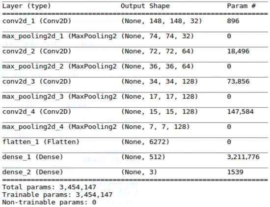 In this study, we considered a VGG16 []-based model architecture with transfer learning. This model is re-trained using a small weed dataset and the final layers are rearranged to classify three different weeds. Transfer learning re-trains the final layers of the VGG16 model to classify new objects from a new dataset by using the large number of features already learned from the Imagenet database. Prior studies [,,] have demonstrated that transfer learning offers significant computational advantages over learning from scratch, and its applicability extends to diverse categorization tasks. The training simulations are executed on a workstation equipped with an Intel Core i7 processor, 8 GB of RAM, and an Nvidia GTX 1060 graphics card with 6 GB of dedicated memory. The construction of models is facilitated through the utilization of the Keras library, which operates on the TensorFlow backend and is implemented in Python 3.5.