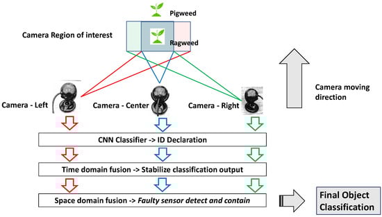 Multi-sensor fusion seeks to overcome the limitations and uncertainties of a single sensor, creates more extensive recognition of the environment around the sensors, and improves the perceptual ability of the system []. As an example, a level 4/5 autonomous vehicle can have 4–6 radars, 1–5 Lidars, 6–12 cameras, and 8–16 ultrasonic sensors []. Weed classification for autonomous agricultural robots is an equally challenging task for a single-camera-based system due to noise, vibration, and occlusion. To address this issue, we present a multi-camera-based system with decision-level sensor fusion to improve the limitations of a single-camera-based system in this paper.